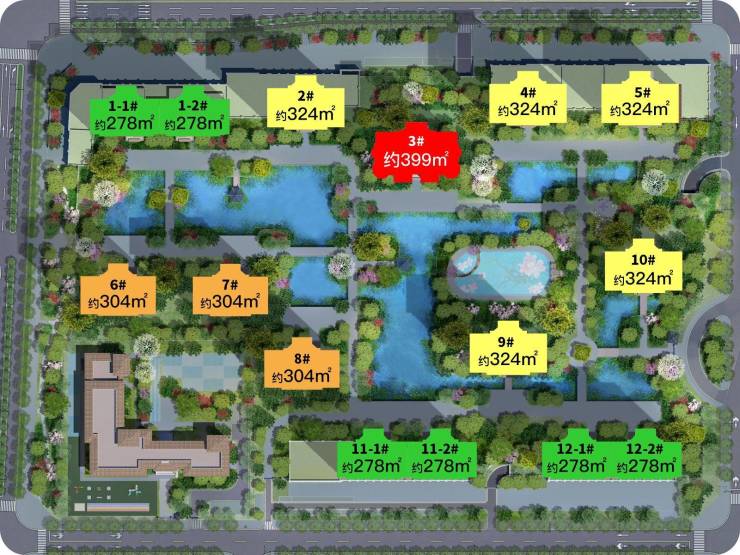 二期规划12栋高层大平层,21-28层,2梯2户;四种户型,278,300,320,400平。层高3.43-3.6m;首层悉数架空,圈层朴实,水系盘绕,装备室外泳池。